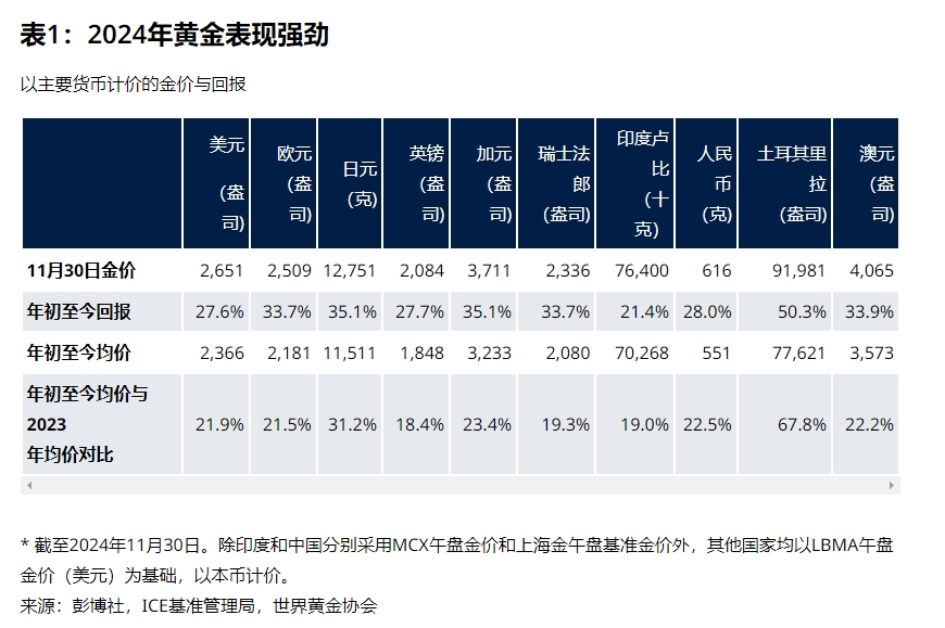 今年迄今為止,以美元計價的金價漲幅超過28%,年平均交易價格較2023年高出22%;其他貨幣金價表現(xiàn)同樣強(qiáng)勁(表1)。今年黃金已40次打破歷史記錄,三季度黃金需求總量首次超過了1,000億美元。