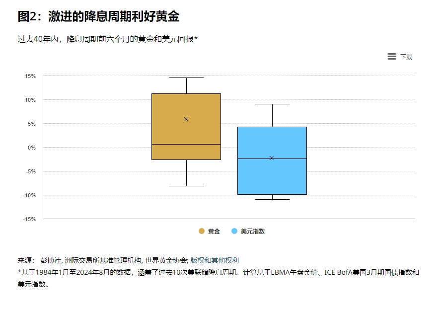 歷史數(shù)據(jù)表明,在降息周期開始的前六個月,金價平均漲幅為6%。而隨后黃金的表現(xiàn)則受到降息周期的持續(xù)時間和深度影響(圖2)。